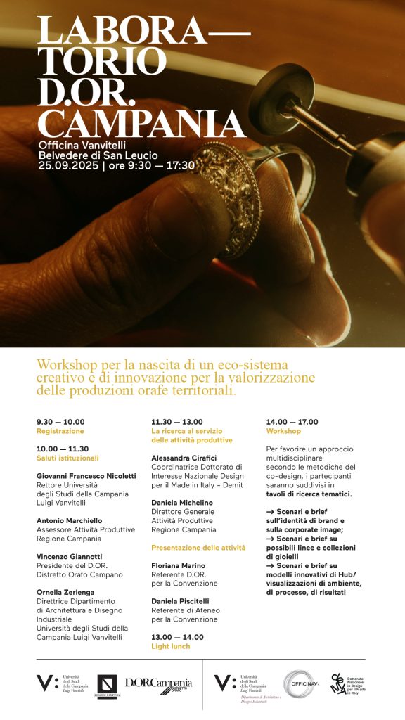 La collaborazione prende il via ad Officina Vanvitelli, coinvolta nella progettazione di linee guida e scenari utili alla progettazione di un Innovation Hub-Centro Studi del D.OR. Campania, avente come obiettivo, nel prossimo futuro, la promozione, la progettazione e il design di un gioiello sostenibile e identificativo delle manifatture e delle qualità del territorio campano.